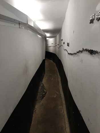 Op de eerste foto zie je een overzicht van alle tunnels op Kinmen, op de tweede foto zie je de route die we hebben gelopen: een blauwe lijn die overgaat in een groene. En op de laatste foto de uitgang van de tunnel. Blij dat we er waren want bijna op het einde kwam Loek nog onder stroom te staan...